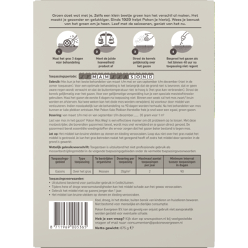 Heb je last van mos in je gazon? Met Pokon Mos Weg! kun je snel van dit probleem afkomen. Deze effectieve mosbestrijder verwijdert mos binnen één week en bevat daarnaast gazonmest, die je gras direct van belangrijke voedingsstoffen voorziet. De gazonmest helpt je gazon sterker te worden en beter bestand tegen nieuwe mosgroei. Voor het beste resultaat gebruik je het product tussen maart en mei of van september tot december, wanneer de temperatuur gematigd is. Vermijd het gebruik in de zomer, want dan is de kans op verbranding van het gras groter. Maai je gazon voor gebruik en zorg ervoor dat het binnen 48 uur na toepassing niet regent. Het mos zal binnen een week zwart en bruin worden en afsterven. Na twee weken kun je het dode mos verwijderen met verticuteren. Herhaal de behandeling indien nodig na 90 dagen. Let wel, het product kan bruine vlekken veroorzaken op stenen en kleding, dus wees voorzichtig.