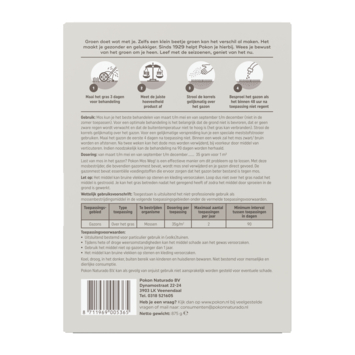 Heb je last van mos in je gazon? Met Pokon Mos Weg! kun je snel van dit probleem afkomen. Deze effectieve mosbestrijder verwijdert mos binnen één week en bevat daarnaast gazonmest, die je gras direct van belangrijke voedingsstoffen voorziet. De gazonmest helpt je gazon sterker te worden en beter bestand tegen nieuwe mosgroei. Voor het beste resultaat gebruik je het product tussen maart en mei of van september tot december, wanneer de temperatuur gematigd is. Vermijd het gebruik in de zomer, want dan is de kans op verbranding van het gras groter. Maai je gazon voor gebruik en zorg ervoor dat het binnen 48 uur na toepassing niet regent. Het mos zal binnen een week zwart en bruin worden en afsterven. Na twee weken kun je het dode mos verwijderen met verticuteren. Herhaal de behandeling indien nodig na 90 dagen. Let wel, het product kan bruine vlekken veroorzaken op stenen en kleding, dus wees voorzichtig.