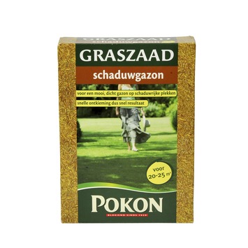 Graszaad ter herstel van kale plekken in schaduwgazons. Kiemt erg snel dus een extra snel resultaat door speciale gele coating die o. a. Pokon Startvoeding bevat. De coating voorkomt dat de zaadjes wegwaaien of wegspoelen, ook houdt de coating water beter vast. Voor 20-30m2.