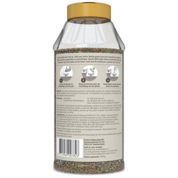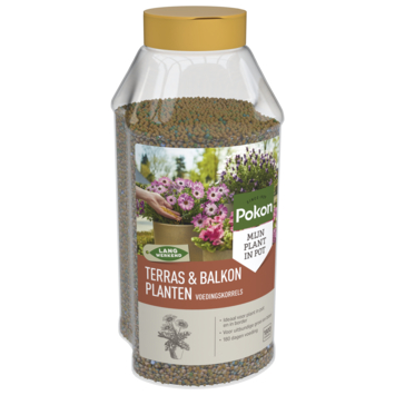 Verwen je planten dit seizoen met Pokon terras & balkon planten voedingskorrels 1800 gr. Deze slimme voedingskorrels zorgen ervoor dat je planten exact de juiste hoeveelheid voeding krijgen wanneer ze die nodig hebben, tot wel 180 dagen lang. Perfect voor zowel potten als borders, ze bevorderen de groei en bloei van al je planten fundamenteel. Voeg de korrels slechts éénmaal per seizoen toe, bij voorkeur in de lente of bij het verpotten, en geniet van een prachtig bloeiende tuin. Strooi de korrels gelijkmatig, meng ze door de grond en geef meteen water. Voor de border heb je 125 gram per m² nodig, terwijl potten of bloembakken baat hebben bij 50 gram per 15 liter potgrond.
