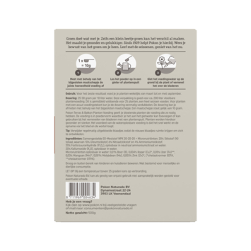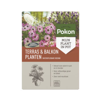Pokon terras & balkon planten wateroplosbare voeding 500 gr is de perfecte keuze voor je bloeiende planten op het terras of balkon. De voeding is in poedervorm en kan gemakkelijk opgelost worden in gietwater of gebruikt worden in een plantenspuit om de bladeren te vernevelen. Dankzij deze snelle opname via zowel de wortels als de bladeren krijgt je plant direct de benodigde voedingsstoffen, wat resulteert in uitbundige groei en bloei. Gebruik de voeding wekelijks van maart t/m september voor het beste resultaat. Meet 25-30 gram per 10 liter water met het bijgevoegde maatschepje. Voor planten met een acuut voedingstekort kun je de dosering eenmalig verdubbelen.