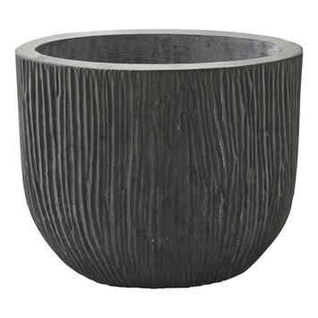 Deze ronde grijze buitenpot (29x22 cm) is vervaardigd uit cement en heeft een afwerking met strepen. Dit geeft de buitenpot een stoer en toch verfijnd uiterlijk. De buitenpot is handgemaakt en weersbestendig, dit maakt deze pot zeer geschikt voor tuin en terras. De pot is voorzien van een opening voor afwatering waardoor er nooit teveel water in de pot achterblijft.