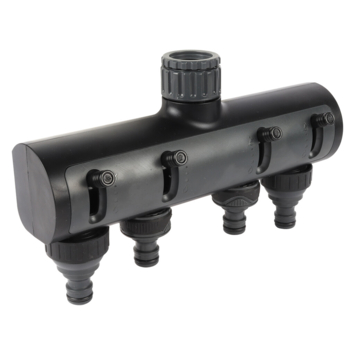 Je koppelt dit kraanstuk gemakkelijk met een waterkraan met een schroefdraad van 3/4 of 1 inch. In de praktijk komt dit neer op 26,5 of 33,3 millimeter. De vier nippels sluiten aan op universele watersystemen. Denk daarbij aan een zwenksproeier, een besproeiingscomputer of een cirkelsproeier. Zorg bij het aansluiten van deze watersystemen dat je de klik goed hoort. Laat het water eerst rustig sijpelen. Controleer of er geen lek ontstaat bij de aansluiting van de nippels. Zo weet je dat je het water harder kunt laten stromen en de druk kunt opbouwen.