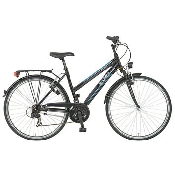 De Prophete Entdecker 1.3 trekkingfiets voor dames is de ideale fiets voor het afleggen van langere afstanden. Dankzij de 21 Shimano versnellingen past u eenvoudig uw snelheid aan bij bijvoorbeeld tegenwind of het beklimmen van een steile helling. De fiets is uitgerust met V-brakes, een verende vork, handige LED verlichting en een Prophete trekking stuur en zadel. Model: 28".