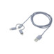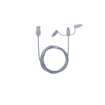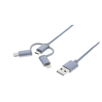 Deze textiele datakabel biedt veelzijdigheid met drie aansluitmogelijkheden: USB naar USB-C, micro USB en iPhone 8-pins. Perfect om je apparaten op te laden of data over te zetten. De stevige textielkabel gaat lang mee en voorkomt knikken. Een handige oplossing voor al je apparaten.