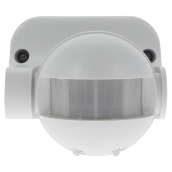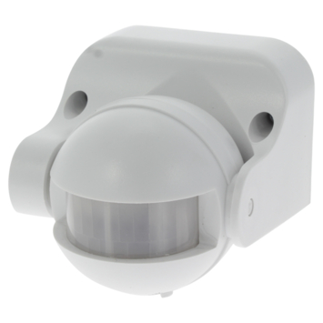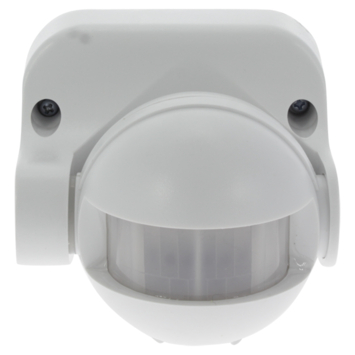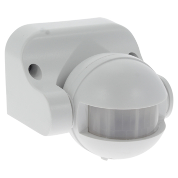 Bewegingsmelder opbouw wand-/plafondmontage. PIR bewegingsmelder met instelbare schemerschakelaar. Brandduur instelbaar van ±10 seconden tot ± 7 minuten. Reikwijdte melder ± 1-8 meter met een straal van 180 graden. Tot maximaal 1200 Watt voor gloeilampen, max. 300 Watt voor TL-lamp. Spatwaterdicht (IP44).