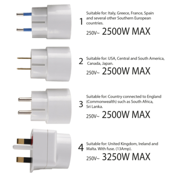 Wereldwijd universele internationaal reisstekker. Max 13A 250V (zonder randaarde), geschikt voor de meest gebruikte stopcontactenaansluitingen in de wereld. Stekker 1: Zuid Europa ( Italie, Spanje, Frankrijk, Griekenland en diverse andere zuid europese landen. Stekker 2: Amerikaanse voor vrijwel de gehele VS, Canada, midden Oosten, Zuid-Amerika en diverse Aziatische Landen. Stekker 3: Afrikaanse / Aziatische stekker . Stekker 4: Engelse stekker geschikt voor Engeland, Schotland en andere met Engeland verbonden Landen