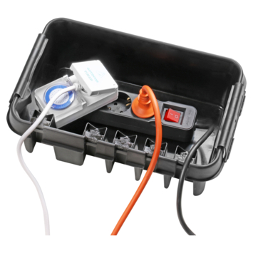 Simpel maar doeltreffend, en voldoende ruim voor een aantal stekkers/stekkerdoos. Het is goed waterdicht, tijdens een plensbui vastgesteld. Best veel geld voor een stukje plastic maar wel een oplossing die werkt!