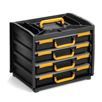 De Raaco assortimentsdoos Handybox is een slimme opbergoplossing voor iedereen die graag georganiseerd werkt. Deze mobiele box bevat vier vakkendozen, elk met 13 uitneembare inzetbakjes, ideaal voor het netjes opbergen van schroeven, pluggen en andere kleine materialen. Dankzij de transportbeveiliging blijven de bakjes goed op hun plek tijdens het verplaatsen. De box is stapelbaar, koppelbaar en geschikt voor wandmontage. Gemaakt van stevig polypropyleen met een afmeting van 37,6 × 26,5 × 31 cm. Praktisch in gebruik en geschikt voor elke werkplaats of garage.