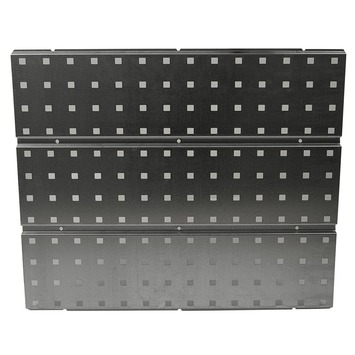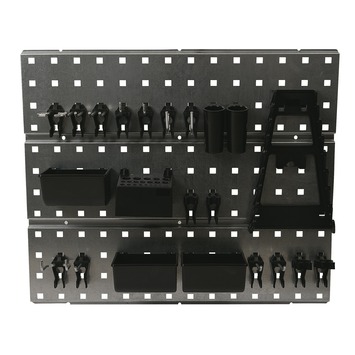 Het Raaco starterspakket grijs bestaat uit twee geperforeerde wandpanelen en 22 haken. Alle onderdelen zijn los en kan naar eigen wens worden ingevuld.