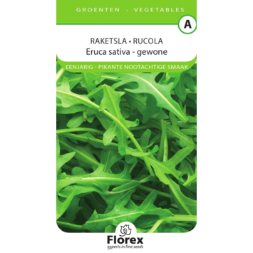 Raketsla, Rucola (Eruca sativa) Pikante nootachtige smaak. De Raketsla, Zaadjes bloeien in Maart, April, Mei, Juni, Juli, Augustus, September. Dit is een Eenjarig plant Deze zaadjes kunnen gepland worden in Maart, April, Mei, Juni, Juli, Augustus, September en ontkiemen in 28 dagen.