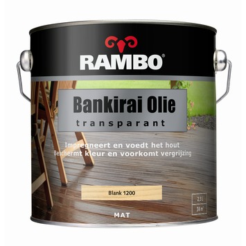 Rambo bankirai olie transparant kleurloos mat 2,5 liter is een transparante verzorgende en beschermende olie speciaal geschikt voor bankirai hout en tropisch hardhout in de tuin. De transparante olie behoudt het natuurlijke karakter van het hout. Rambo bankirai olie transparant kleurloos mat 2,5 liter is ook verkrijgbaar in 750 ml.