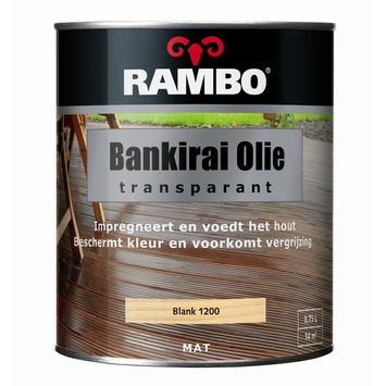 Rambo bankirai olie transparant kleurloos mat 750 ml is een transparante verzorgende en beschermende olie speciaal geschikt voor bankirai hout en tropisch hardhout in de tuin. De transparante olie behoudt het natuurlijke karakter van het hout. Rambo bankirai olie transparant kleurloos mat 750 ml is ook verkrijgbaar in 2,5 liter.