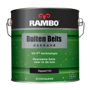 Rambo buitenbeits dekkend diepzwart zijdeglans 2,5 liter is een dekkende buitenbeits met uv bescherming. Het is een duurzame en vochtwerende beits voor hout in de tuin. Het product is speciaal geschikt voor gevelbetimmeringen, daklijsten, schuren, tuinhuizen en schuttingen. Rambo buitenbeits dekkend is verkrijgbaar in verschillende inhoudsmaten, transparante kleuren en dekkende kleuren, waaronder Rambo buitenbeits dekkend diepzwart zijdeglans 2,5 liter.