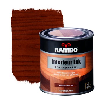 Rambo interieurlak transparant koloniaal teak zijdeglans 250 ml is een transparante interieurlak voor een nette afwerking binnenshuis. Het product is speciaal geschikt voor meubels, kozijnen, deuren en betimmeringen. Rambo interieurlak is verkrijgbaar in verschillende inhoudsmaten, dekkende kleuren en transparante kleuren, waaronder Rambo interieurlak transparant koloniaal teak zijdeglans 250 ml.