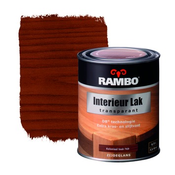 Rambo interieurlak transparant koloniaal teak zijdeglans 750 ml is een transparante interieurlak voor een nette afwerking binnenshuis. Het product is speciaal geschikt voor meubels, kozijnen, deuren en betimmeringen. Rambo interieurlak is verkrijgbaar in verschillende inhoudsmaten, dekkende kleuren en transparante kleuren, waaronder Rambo interieurlak transparant koloniaal teak zijdeglans 750 ml.