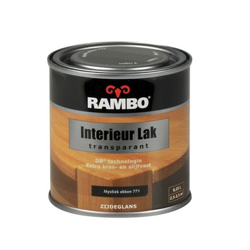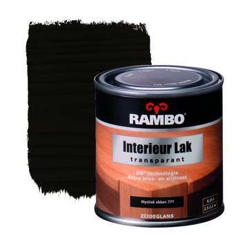Rambo interieurlak transparant mystiek ebben zijdeglans 250 ml is een transparante interieurlak voor een nette afwerking binnenshuis. Het product is speciaal geschikt voor meubels, kozijnen, deuren en betimmeringen. Rambo interieurlak is verkrijgbaar in verschillende inhoudsmaten, dekkende kleuren en transparante kleuren, waaronder Rambo interieurlak transparant mystiek ebben zijdeglans 250 ml.