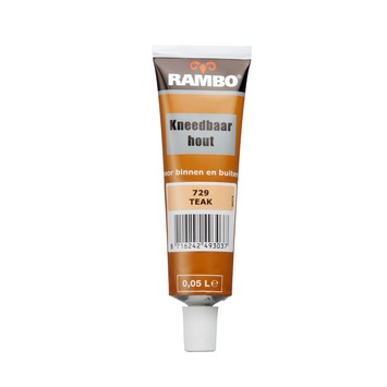 Rambo kneedbaar hout teak 50 ml is een houtvuller voor naden, scheuren en gaatjes in het hout. Het droogt snel, krimpt niet, werkt het hout glad af en is makkelijk te schuren. Rambo Kneedbaar in verschillende kleuren, waaronder teak.