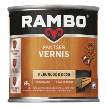 Rambo Pantser Vernis zijdeglans kleurloos 250 ml is de optimale bescherming voor (gelakte) meubelen, deuren, kozijnen, lambriseringen en hout binnenshuis. De lak is vocht- en vuil werend en extra kras- en slijtvast. Het vloeit mooi uit en beschermt jaren met een blijvende mooie matte uitstraling. Geschikt voor houten deuren, kozijnen, betimmeringen en meubels binnen. Het rendement van dit product is 12 m2 per liter.