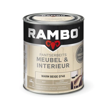 Rambo Pantserbeits Meubel & Interieur is een 1-pot-systeem beits voor het beschermen en verfraaien van meubels, deuren, kozijnen, lambriseringen en hout binnenshuis. De beits is gemakkelijk aan te brengen en is vocht- en vuilwerend en stoot- en krasvast. Afhankelijk van het gewenste effect in 1 laag klaar. Rambo Pantserbeits Meubel & Interieur is makkelijk verwerkbaar, geurarm en laat de houtnerf zichtbaar blijven. De beits is verkrijgbaar in 8 mooie vintage kleuren.