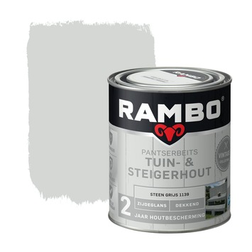 Met de Rambo Pantserbeits Vintage tuin- en steigerhout zijdeglans dekkend steen grijs 750 ml geef je hout een fraaie vintage uitstraling en bescherm je het hout twee jaar lang tegen diverse weersomstandigheden. Deze beits is geschikt voor alle soorten hout, inclusief geïmpregneerd hout. Vergeet niet geïmpregneerd hout eerst even af te borstelen. Roer de inhoud goed door na het openen van de pot. De beits is het beste te gebruiken bij temperaturen tussen de 10 en 25 graden Celsius. Strijk de laatste laag altijd in de richting van de houtnerf voor het beste resultaat. Na ongeveer 4 uur kun je een tweede laag aanbrengen. De hoeveelheid beits die je nodig hebt, hangt af van de structuur en staat van de ondergrond.