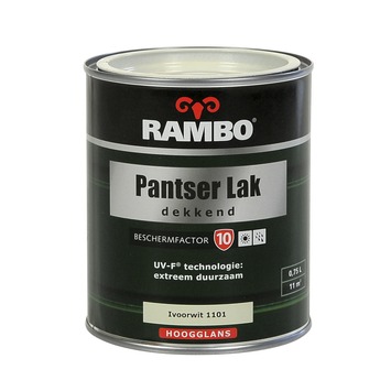 Rambo pantserlak ivoorwit hoogglans 750 ml is een dekkende duurzame lak voor uitstekende afwerking van het hout aan uw huis. De hoogglanzende lak is speciaal geschikt voor deuren, daklijsten, kozijnen en gevelbetimmeringen. Rambo pantserlak is verkrijgbaar in verschillende inhoudsmaten en dekkende kleuren, waaronder Rambo pantserlak ivoorwit hoogglans 750 ml.