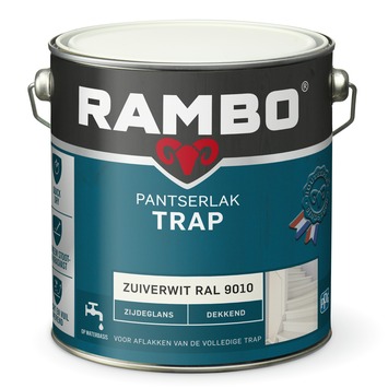 Rambo pantserlak trap dekkend zijdeglans zuiverwit 2,5 liter is extra snel droog, geurarm en vergeelt niet. Trappen hebben het extra zwaar, speciaal daarvoor is er Rambo pantserlak trap. Ook is de lak zeer kras- en slijtvast, vloeit mooi uit en beschermt jaren met een blijvende zijdeglans. Geschikt voor de gehele trap (trap - en trapopbouw). Het rendement van dit product is 12 m2 per liter.