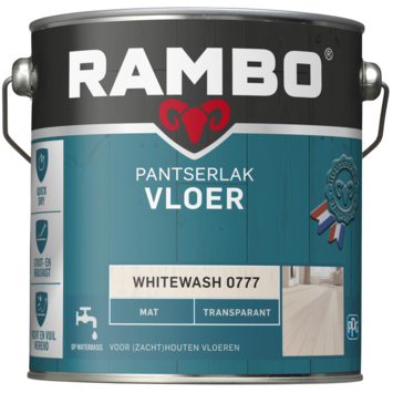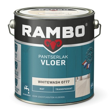 Rambo pantserlak vloer transparant mat whitewash 2,5 ml beschermt (zacht)houten vloeren, mét behoud van het natuurlijke karakter van hout. Geef je vloer extra bescherming met deze speciaal door Rambo ontwikkelde transparante vloerlak op acrylbasis. De lak is extra snel droog, geurarm en vergeelt niet. Ook is de lak zeer kras- en slijtvast. Het vloeit mooi uit en beschermt jaren met een mooie matte uitstraling. Het rendement van dit product is 12 m2 per liter.