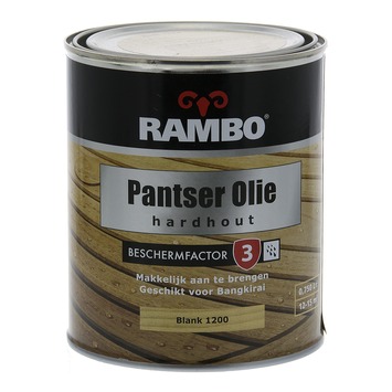 Rambo pantserolie hardhout kleurloos 750 ml is een hoogwaardige olie speciaal voor hardhout. Het beschermt het hout tegen vocht en verwering. De olie is speciaal voor geschikt voor schuttingen, tuinbanken, plantenbakken en tuinhout. De inhoudsmaat is 750 ml.