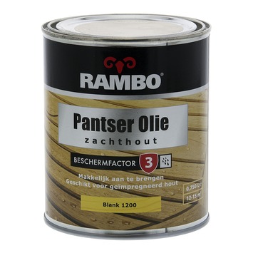 Rambo pantserolie zachthout kleurloos 750 ml is een hoogwaardige olie speciaal voor zachthout buiten. Het beschermt het hout tegen vocht en verwering. De olie is speciaal voor geschikt voor schuttingen, tuinbanken, plantenbakken en tuinhout. De inhoudsmaat is 750 ml.