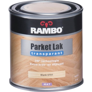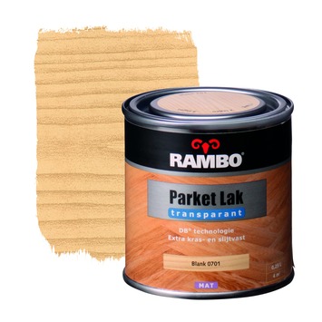 Rambo parketlak kleurloos mat 250 ml is een kleurloze matte lak op waterbasis speciaal voor parket en hardhouten vloeren. Deze kras- en stootvaste lak zorgt voor uitstekende, duurzame bescherming van uw vloer. Omdat de lak op waterbasis is, droogt de lak snel en blijft er geen sterke verflucht achter. De inhoudsmaat is 250 ml.