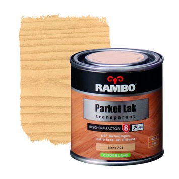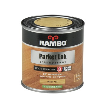 Rambo parketlak kleurloos zijdeglans 250 ml is een kleurloze zijdeglans lak speciaal voor parket en hardhouten vloeren. Deze kras- en stootvaste lak zorgt voor uitstekende, duurzame bescherming van uw vloer. De inhoudsmaat is 250 ml.