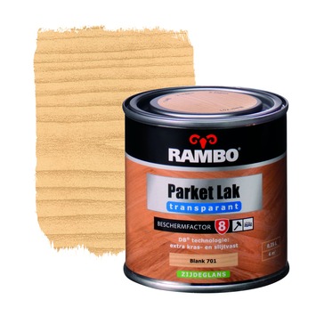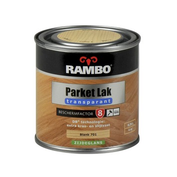 Rambo parketlak kleurloos zijdeglans 250 ml is een kleurloze zijdeglans lak op waterbasis speciaal voor parket en hardhouten vloeren. Deze kras- en stootvaste lak zorgt voor uitstekende, duurzame bescherming van uw vloer. Omdat de lak op waterbasis is, droogt de lak snel en blijft er geen sterke verflucht achter. De inhoudsmaat is 250 ml.