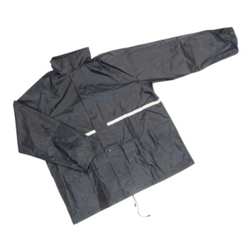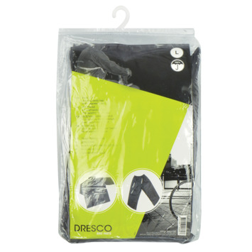 Het zwarte uniseks Dresco regenpak maat large is gemaakt van soepel polyester en is 100% waterdicht. De regenjas en regenbroek hebben getapete naden. De regenjas heeft aan de voorzijde een stevige ritssluiting en een overslag met drukknopen. De mouwen van de regenjas sluiten de polsen hermetisch af tegen de wind door de afwerking met elastiek en de verlengde mouwen. De jas heeft een veilige reflectiestreep, zodat u in het donker ook goed zichtbaar bent. De vaste geïntegreerde capuchon is in de kraag van de jas op te bergen. Voorzien van twee zakken met regen overslag tegen inregenen. De regenbroek heeft een elastische tailleband en twee open zakken. De broekspijpen zijn verstelbaar rond de enkel met drukknopen. Het regenpak is handig op te bergen in een tasje met rijgkoord.