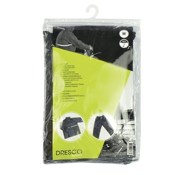 Het zwarte uniseks Dresco regenpak maat medium is gemaakt van soepel polyester en is 100% waterdicht. De regenjas en regenbroek hebben getapete naden. De regenjas heeft aan de voorzijde een stevige ritssluiting en een overslag met drukknopen. De mouwen van de regenjas sluiten de polsen hermetisch af tegen de wind door de afwerking met elastiek en de verlengde mouwen. De jas heeft een veilige reflectiestreep, zodat u in het donker ook goed zichtbaar bent. De vaste geïntegreerde capuchon is in de kraag van de jas op te bergen. Voorzien van twee zakken met regen overslag tegen inregenen. De regenbroek heeft een elastische tailleband en twee open zakken. De broekspijpen zijn verstelbaar rond de enkel met drukknopen. Het regenpak is handig op te bergen in een tasje met rijgkoord.