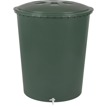 Deze regenton groen conisch 310 liter wordt zeer veel verkocht omdat hij voordelig is en toch een grote inhoud heeft. Daar kun je aardig wat planten mee goedkoop water geven. De ton heeft een kindveilige deksel en een witte aftapkraan. De conisch groene regenton heeft een diameter van 79 centimeter, een hoogte van 93 centimeter en een inhoud van 310 liter. Het materiaal van de waterton is vrijwel onverwoestbaar. Vorst, regen en dergelijke weersomstandigheden hebben geen vat op deze regenton, wel dien je de regenton leeg te maken bij vorstgevaar. Daarnaast bestaat de ton voor 75% uit gerecycled plastic en beschikt over 1 jaar fabrieksgarantie. Plaats voor extra hoogte onder de regenton een regenton voet zodat je gemakkelijk met een emmer het water uit de kraan kan halen.