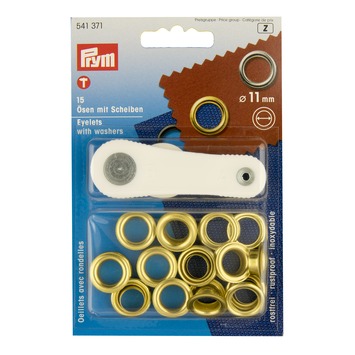 De ringen 11mm messing 15 stuks, vormen een doe het zelf set van Prym. Deze set van Prym bestaat uit 15 stuks messing ringen/zeilogen met diameter van 11 millimeter en wordt inclusief montage gereedschap geleverd. Deze messing ringen zijn roestvrij en kunnen ook aangebracht worden met de vario drukknopen tang van Prym.