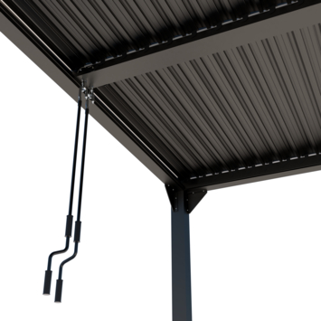De pergola heeft een verstelbare schutterdak met draaibare lamellen, deze kunnen open of dicht gedraaid worden met een draaistang. Door deze dicht te draaien ben je beschut tegen de zon en is deze gelijk spat waterdicht bij regen. Deze kan ook open gedraaid worden op zonnige dagen. De twee helften op het dak kunnen afzonderlijk van elkaar versteld worden.