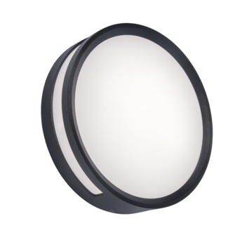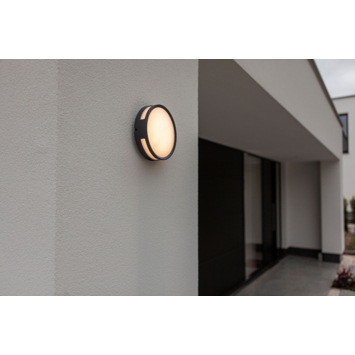 De ronde buitenwandlamp Rola in het donker grijs met geïntegreerde LED en warm licht heeft een decoratief frame van aluminium. Een elegante wand- en plafonddecoratie die uw buitenruimtes verlicht.