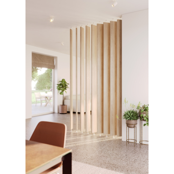 Een trendy afscheiding maken in uw woning was nog nooit zo eenvoudig. Met deze draaibare lamellen maakt u een afscheidingswand die makkelijk te monteren is. Na montage kunt u de lamellen verdraaien naar eigen wens. Deze roomdivider is verkrijgbaar in 3 kleuren: zwart, wit en eik. Deze divider bestaat ook in ellips vormige variant.