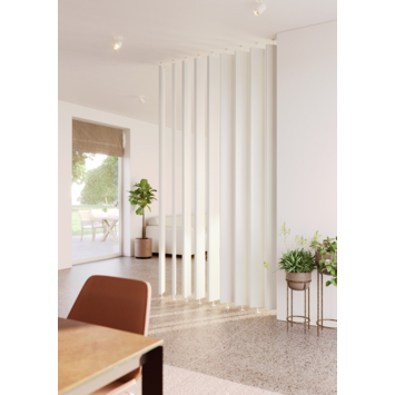 Een trendy afscheiding maken in uw woning was nog nooit zo eenvoudig. Met deze draaibare lamellen maakt u een afscheidingswand die makkelijk te monteren is. Na montage kunt u de lamellen verdraaien naar eigen wens. Deze roomdivider is verkrijgbaar in 3 kleuren: zwart, wit en eik. Deze divider bestaat ook in ellips vormige variant.