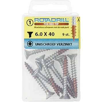 Deze Rotadrill® universeel te gebruiken platkopschroeven van verzinkt staal zijn bedoeld voor gebruik binnenshuis in hout of in een plug en hebben een pozi-aandrijving. De rode punt aan de Rotadrill® schroeven is een gepatenteerd smeermiddel dat ervoor zorgt dat de schroeven zeer licht indraaien en dus voor optimaal schroefgemak. Hierdoor zijn de schroeven zeer gemakkelijk te verwerken in verschillende bouwmaterialen. De platverzonken kop verzinkt netjes in het hout bij het aanschroeven en is bedoeld voor hout-op-hout verbindingen. De schroeven worden geleverd in een stevige kunststof bewaarverpakking.