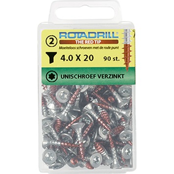 Zoek je een multifunctionele schroef die je binnenshuis in hout of in een plug kunt gebruiken? Ga dan voor de Rotadrill schroef universeel platkop torx verzinkt 4.0x20 mm 90 stuks. Deze universele schroef van Rotadrill wordt ook wel een spaanplaatschroef genoemd en is de meestgebruikte schroef voor hout, maar ook plaatmaterialen zoals spaanplaten of houtvezelplaten. De schroef is afgewerkt met een platkop, wat inhoudt dat hij een tapstoelopend gedeelte onder de kop heeft die mooi in het materiaal wegzakt. De schroef heeft een torxkop van het type T20. Je kunt hem dus met een torx-bitje of schroevendraaier indraaien. Bovendien is de schroef gemaakt van verzinkt staal en dus zeer goed bestand tegen stoten en slijtage, maar minder goed tegen vocht. De rode punt aan de Rotadrill-schroeven is gepatenteerd smeermiddel dat ervoor zorgt dat de schroeven zeer licht indraaien en makkelijk te verwerken zijn in verschillende bouwmaterialen. Dit product wordt verkocht per 90 stuks, dus je hebt altijd een schroef achter de hand. Andere maat nodig? Geen probleem, want GAMMA heeft een breed assortiment van verschillende materialen, schroefmaten en kopvormen. Kortom: optimaal schroefgemak met deze universele schroef van Rotadrill.