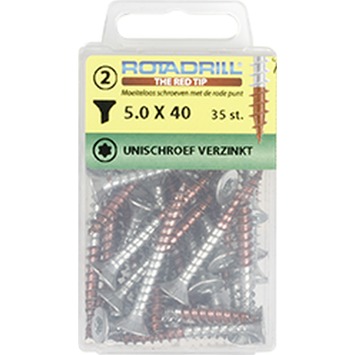 Zoek je een multifunctionele schroef die je binnenshuis in hout of in een plug kunt gebruiken? Ga dan voor de Rotadrill schroef universeel platkop torx verzinkt 5.0x40 mm 35 stuks. Deze universele schroef van Rotadrill wordt ook wel een spaanplaatschroef genoemd en is de meestgebruikte schroef voor hout, maar ook plaatmaterialen zoals spaanplaten of houtvezelplaten. De schroef is afgewerkt met een platkop, wat inhoudt dat hij een tapstoelopend gedeelte onder de kop heeft die mooi in het materiaal wegzakt. De schroef heeft een torxkop van het type T20. Je kunt hem dus met een torx-bitje of schroevendraaier indraaien. Bovendien is de schroef gemaakt van verzinkt staal en dus zeer goed bestand tegen stoten en slijtage, maar minder goed tegen vocht. De rode punt aan de Rotadrill-schroeven is gepatenteerd smeermiddel dat ervoor zorgt dat de schroeven zeer licht indraaien en makkelijk te verwerken zijn in verschillende bouwmaterialen. Dit product wordt verkocht per 35 stuks, dus je hebt altijd een schroef achter de hand. Andere maat nodig? Geen probleem, want GAMMA heeft een breed assortiment van verschillende materialen, schroefmaten en kopvormen. Kortom: optimaal schroefgemak met deze universele schroef van Rotadrill.