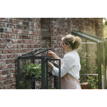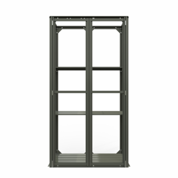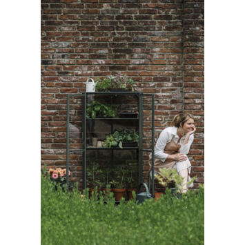 Wil je planten kweken op je balkon of terras? De Urban Grower large van Royal Well maakt het makkelijk. Deze compacte kweekkast is 141,5 cm hoog en past ook in kleinere buitenruimtes. Dankzij het stevige aluminium frame en de 3 mm polycarbonaat panelen bescherm je jonge planten tegen kou, wind of ongedierte. De kast heeft twee openslaande deuren en een dakraam dat je in verschillende standen kunt openen voor ventilatie. Binnenin zitten meerdere verplaatsbare schappen. Handig als je wat potten wilt verplaatsen of ruimte nodig hebt voor hogere planten. De grijsgroene coating geeft de kast een rustige uitstraling. Je zet de Urban Grower eenvoudig in elkaar met het meegeleverde montagemateriaal en de handleiding.