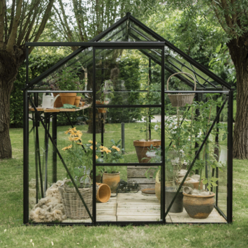 De Royal Well Kate I kweekkas in zwart is dé keuze voor tuinliefhebbers die serieus willen kweken. Met een kweekruimte van 3,67 m² biedt deze kas voldoende ruimte voor je favoriete planten en groenten. De robuuste constructie van aluminium en veiligheidsglas zorgt ervoor dat je gewassen veilig en duurzaam kunnen groeien. Dankzij de nokhoogte van 215 cm heb je niet alleen de ruimte om te planten, maar ook om rechtop te werken, wat het tuinieren een stuk aangenamer maakt. De schuifdeur maakt het makkelijk om de kas in en uit te gaan, en de automatische raamopener zorgt voor een perfecte ventilatie, zodat je planten altijd frisse lucht krijgen. Het full options pakket bevat alles wat je nodig hebt, zoals een geïntegreerd schap en tomatenspiralen, zodat je direct kunt beginnen met kweken!