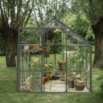 De Royal Well Kate II kweekkas in groengrijs met Full Option Pakket biedt alles wat je nodig hebt om een groen paradijs te creëren. Met een ruime binnenoppervlakte van 4,83 m² heb je genoeg ruimte voor allerlei planten en groenten. Het zadeldak geeft de kas een stijlvolle uitstraling, terwijl de nokhoogte van 215 cm zorgt voor voldoende ruimte om rechtop te werken. De stevige aluminium constructie en het 3 mm veiligheidsglas beschermen je gewassen tegen de elementen. Het pakket bevat bovendien handige accessoires zoals een geïntegreerd schap, een tafel, vier pothouders in dezelfde kleur als de kas, twee 15-liter containers, één van 40 liter en vier zwarte tomatenspiralen. De automatische raamopener zorgt voor een uitstekende ventilatie, zodat je planten altijd de juiste luchtcirculatie krijgen. Vergeet niet de funderingankers mee te bestellen als je de kas op onverharde grond plaatst. Deze kweekkas is de ideale combinatie van functionaliteit en stijl voor elke tuin!