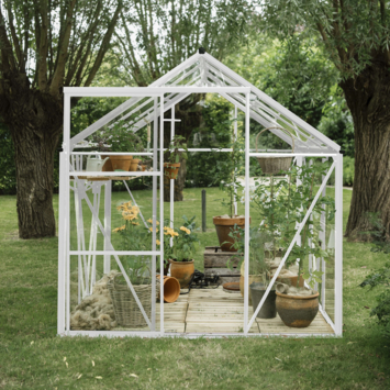 Het Full Option Pakket Kate III van Royal Well is de ideale kweekkas voor iedereen die serieus wil tuinieren! Deze mooie witte kas biedt met een binnenoppervlakte van 6,0 m² volop ruimte voor je favoriete planten. De nokhoogte van 215 cm zorgt ervoor dat je comfortabel rechtop kunt werken. Het zadeldak ziet er niet alleen prachtig uit, maar draagt ook bij aan de afwatering, zodat regenwater optimaal kan wegstromen. Dankzij de stevige aluminium constructie en het 3 mm dikke veiligheidsglas is deze kas bestand tegen verschillende weersomstandigheden. Het Full Options pakket bevat alles wat je nodig hebt om direct te beginnen, van een geïntegreerd schap tot een automatische raamopener. Met twee ramen voor de ventilatie blijven je planten altijd goed geventileerd. De perfecte keuze voor elke enthousiaste tuinier.
