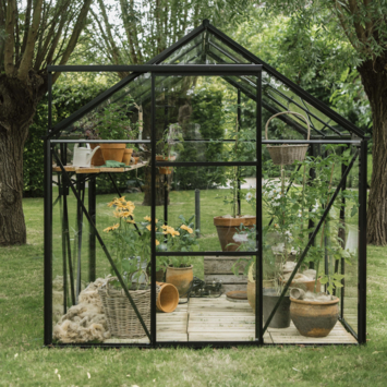 De Royal Well Kate V kweekkas in zwart biedt alles wat je nodig hebt om optimaal te tuinieren. Met een ruime binnenoppervlakte van 8,33 m² heb je voldoende plek om een breed scala aan planten te kweken. Het stevige aluminium frame en het 3 mm dikke veiligheidsglas beschermen je gewassen tegen de elementen, terwijl de geïntegreerde fundering zorgt voor een stabiele basis. De 215 cm nokhoogte biedt je genoeg ruimte om rechtop in de kas te werken. Het Full Options pakket bevat handige accessoires zoals een schap, tafel, tomatenspiralen en pothouders, zodat je meteen aan de slag kunt. Deze kweekkas is ideaal voor tuinliefhebbers die een praktische en stijlvolle oplossing zoeken!