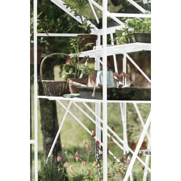 De witte kweektafel voor tuinkas Mary IV is de perfecte aanvulling voor je kas! Of je nu zaait, verpot of je planten watergeeft, deze tafel maakt al je tuinwerkzaamheden een stuk gemakkelijker. Dankzij de instelbare hoogte werk je altijd op de ideale werkhoogte, zonder dat je door je knieën hoeft te gaan of op de grond hoeft te zitten. De kweektafel past in elke kasmaat en biedt voldoende ruimte voor al je materialen. Met de stevige constructie van vier leggers, dragers en schoren kun je al je potten en gereedschappen veilig opbergen. De diepte van 42,5 cm maakt dat deze tafel perfect in de binnenruimte van je kas past. Praktisch en stijlvol, deze kweektafel maakt je tuinwerk nog fijner!